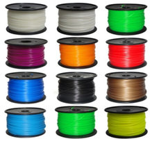 桌面機耗材主要有ABS和PLA,耗材均是直徑1.75mm的卷裝線材,單卷線材重量1kg。兩種材料均有20多種顏色可選擇,包括白色、乳白色、黃色、紅色、黑色、灰色、綠色、橙色等等